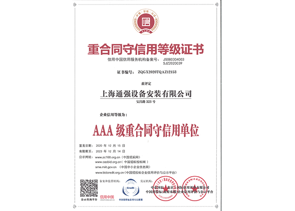 上海通強設備安裝有限公司注冊資金2000萬元,資產總量為100000萬元的專業設備安裝公司,公司專業從事工業與民用建筑的設備安裝、非標設備的制作、鋼結構制作安裝、中央空調系統的安裝,水電及管道的安裝。經過20多年艱苦創業現已成為一個具有國家二級安裝資質,獲得上海市“重合同,守信用”的施工單位。